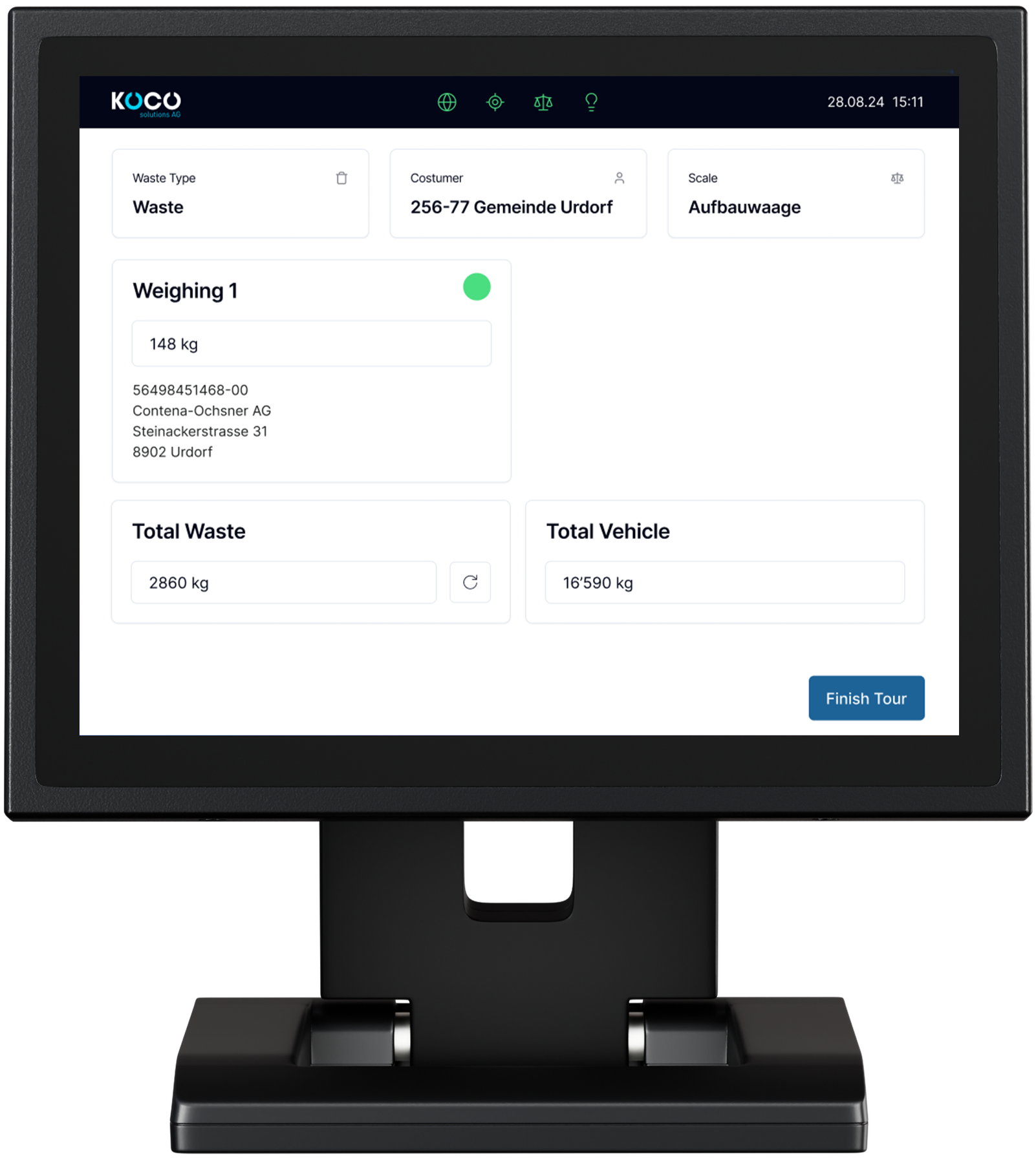 - Präzise Gewichtserfassung der geladenen Abfälle oder Wertstoffe pro Kund:in, Behälter oder Tour